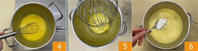 Deberéis cocer al baño maría hasta llegar a 45° medidos con un termómetro de cocina 4. Retirad del fuego y batid bien con batidoras eléctricas o en un robot de cocina hasta que se enfríe 5. Añadid ahora la harina y la fécula previamente tamizadas, unas pocas cucharadas a la vez, mezclando de arriba hacia abajo para no desmontar la mezcla 6.