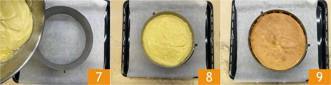 Verted en un aro de 22 cm de diámetro colocado sobre una bandeja con papel de horno 7, deberéis llegar a 3/4 de la capacidad y nivelar 8. Hornead en horno estático precalentado a 175° durante 25 minutos. Una vez cocido, deberá desmoldarse y dejarse templar 9.