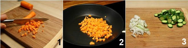 Corta las zanahorias en trozos muy pequeños 1 y colócalas en una sartén antiadherente con el aceite 2; corta los calabacines en rodajas y la cebolleta en rodajas finas 3; cocina las zanahorias durante unos minutos a fuego medio