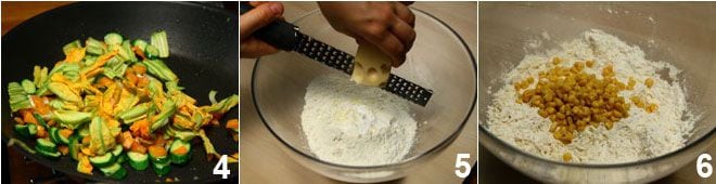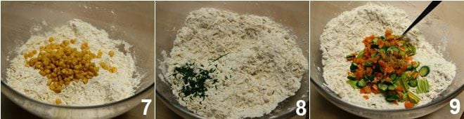 pica también el cebollino y añádelo en el bol 8; vierte también las verduras cocidas 9 y mezcla de nuevo todo;
