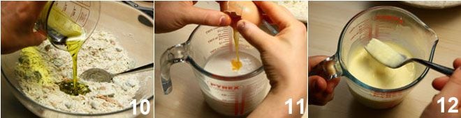 Vierte el aceite en la mezcla 11 y en otro bol vierte la leche, la nata y los dos huevos 11 y bate ligeramente, 12