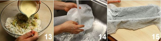 Prepara el molde de bizcocho de 1l de capacidad cubriéndolo con papel de horno que habrás mojado bajo agua corriente 14 y luego escurrido (esto sirve para que se adhiera mejor al molde); úsalo ahora aún húmedo para cubrir el molde 15 haciéndolo adherirse bien a las paredes;