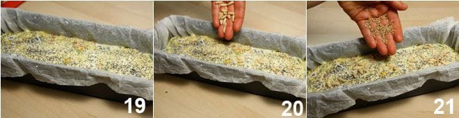 Vierte ahora la mezcla del bizcocho y luego pincela la superficie con leche; espolvorea con semillas de amapola 19, piñones y semillas de sésamo (20-21).