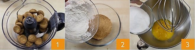 Para preparar el bonet al limón, empiece con los amaretti: póngalos en la licuadora 1 y tritúrelos (también puede desmenuzarlos a mano finamente), luego agregue a la mezcla obtenida la maicena tamizada 2 y reserve la mezcla obtenida. Ponga los huevos en una batidora, o si no tiene una en un bol grande, encienda las varillas y agregue el azúcar poco a poco 3.