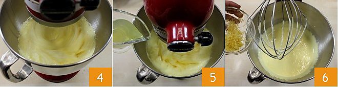 Bata los huevos con el azúcar 4 hasta obtener una crema clara y homogénea. Luego incorpore el limoncello 5 y la ralladura de limón sin tratar 6.