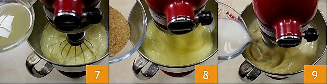 Con las varillas siempre en funcionamiento, vierta el jugo colado de los limones 7, la mezcla de amaretti y maicena que tenía reservada 8 y añada la leche a temperatura ambiente en un hilo continuo 9; continúe mezclando los ingredientes para integrarlos.