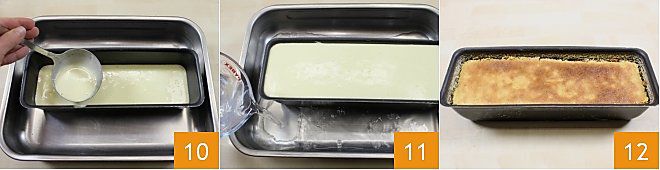 Ahora, tome un molde rectangular para plumcake de 31x12 y de 6 cm de profundidad (o moldes individuales para pudín), colóquelo en una bandeja grande y profunda. Luego vierta la mezcla en el molde ayudándose con un cucharón 10. En este punto, para la cocción al baño maría, vierta agua caliente en la bandeja alcanzando los 2/3 de la altura del molde 11. Cocine el bonet al limón en horno estático precalentado a 180° durante 45-50 minutos (si el horno es con ventilador a 160° durante 40-45 minutos). El bonet estará cocido cuando vea que comienza a separarse de las paredes del molde y la superficie se vea ligeramente dorada; sáquelo entonces del horno y del molde del baño maría con delicadeza; deje enfriar completamente a temperatura ambiente 12. Cuando esté frío, póngalo en la nevera por aproximadamente 1 hora.