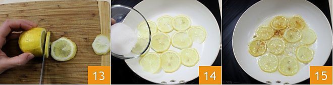 Mientras tanto, prepare la guarnición: lave el limón y córtelo en rodajas finas 13. Transfiera las rodajas a una sartén, agregue el azúcar y cocine unos minutos para caramelizar las rodajas de limón (14-15). Luego apague y deje enfriar.