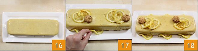 Luego saque el bonet de la nevera, llene un recipiente con agua hirviendo y sumerja el molde con el bonet durante unos segundos en el agua hirviendo para facilitar la extracción del postre. Puede ayudarse con la punta de un cuchillo para despegar más delicadamente el postre de las paredes del molde. Desmolde entonces el postre dándole la vuelta sobre un plato de servir 16. Ahora puede decorar su bonet al limón: distribuya a su gusto las rodajas de limón caramelizadas o frescas sobre la superficie y si desea algunas tiras de cáscara. Añada entonces los amaretti enteros o desmenuzados a su gusto y las rodajas de limón caramelizadas alrededor del postre 17, si lo desea también algunas hojas de menta. ¡Su bonet está listo para servirse 18!