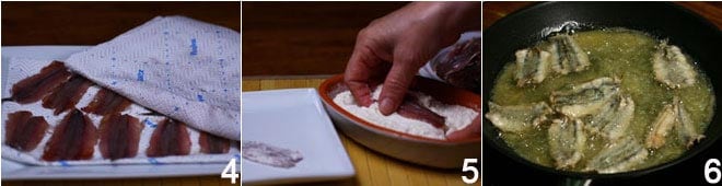 Lava rápidamente y seca los boquerones tamponándolos con papel absorbente 4, luego pásalos por la harina 5 y fríelos en aceite de oliva caliente, 6 dándoles la vuelta por ambos lados; coloca los boquerones fritos sobre papel absorbente para que pierdan el exceso de aceite.