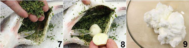 Utiliza una parte del picadillo recién preparado para rellenar el vientre del pescado 7 y añade 2 dientes de ajo sin piel 8. Ahora pasa a la costra de sal: monta las claras a punto de nieve firme y pásalas a un bol 9.