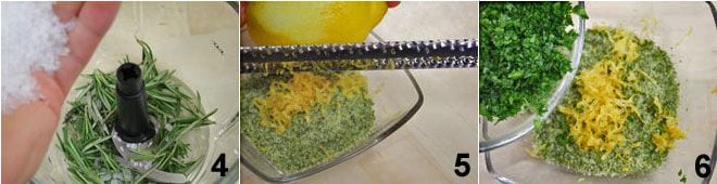 Pica las hierbas aromáticas con un puñado de sal gruesa 4, ralla la cáscara de medio limón en el picadillo 5 y finalmente añade el perejil picado finamente 6.