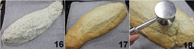Extiende una hoja de papel de horno en una bandeja (o molde) y luego coloca una capa delgada (aproximadamente 1,5 cm) de la mezcla obtenida, que formará el lecho de cocción para la lubina 13. Coloca luego la lubina encima del lecho de sal 14 y cúbrela con la mezcla de sal presionándola suavemente para que se adhiera bien a la masa 15.