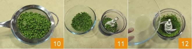 escurrid los guisantes en un colador recogiendo el agua de vegetación en un bol pequeño 10. Tomad la mitad de los guisantes y ponedlos en la batidora 11 trituradlos junto con el agua de vegetación 12