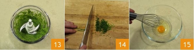 hasta obtener una crema densa y homogénea 13. Reservadla en un bol pequeño y comenzad a preparar la masa: picad el cebollino 14. En un bol comenzad a trabajar el huevo con un batidor 15