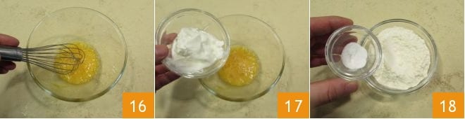 para batirlo 16, luego añadid el yogur 17 y mezclad para integrar el compuesto; aparte en un bol verted la harina junto con el bicarbonato 18