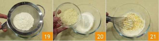 y luego añadidlos al compuesto de huevos cuidando de tamizarlos a través de un colador 19. Sazonad con el queso rallado 20 y mezclad cuidadosamente los ingredientes con un batidor 21.