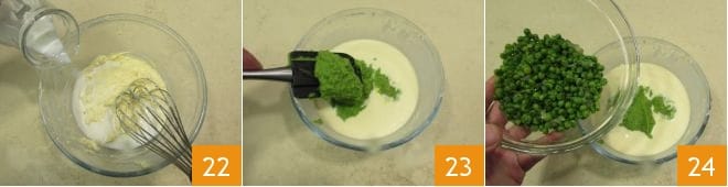 añadid la leche y continuad mezclando 22 para obtener un compuesto homogéneo y sin grumos, añadid también el puré de guisantes 23. Si es necesario, ajustad de sal y pimienta, mezclad y añadid también los guisantes enteros 24