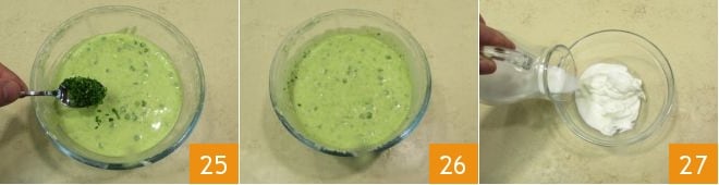 y aromatizad con la mitad del cebollino picado 25. Reservad el compuesto 26 y preparad también la salsa de yogur: en un bol verted el yogur griego y añadid la leche 27.