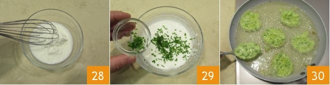Mezclad los ingredientes con un batidor 28 y terminad aromatizando con la otra mitad del cebollino que habéis picado 29. En una sartén calentad el aceite de semillas para freír (no debéis freír en aceite profundo, los buñuelos deben flotar pero no estar completamente sumergidos) y verted una cucharada de masa para formar los buñuelos 30. Para una fritura óptima el aceite debe tener una temperatura de 180°, para monitorizar mejor la cocción se aconseja el uso de un termómetro para alimentos.