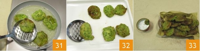 Girad los buñuelos después de un par de minutos para dorarlos también por el otro lado 31, luego escurridlos con la ayuda de una espumadera sobre una bandeja revestida de papel absorbente para escurrirlos y secarlos del exceso de aceite 32. ¡Servid vuestros buñuelos de guisantes, mejor si están bien calientes acompañados con salsa de yogur 33!