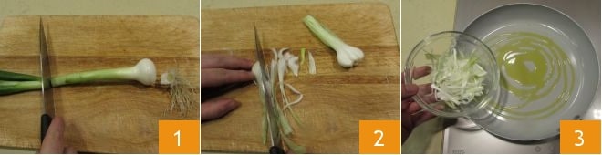 Para preparar los buñuelos de guisantes con salsa de yogur empezad limpiando la cebolleta: eliminad la parte verde del tallo 1, la barba y la capa externa más dura. Luego cortadla en rodajas finas 2. En una sartén calentad un poco de aceite y añadid la cebolleta 3,