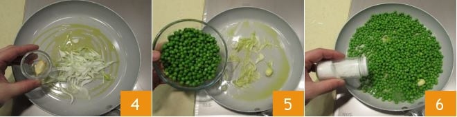 añadid un diente de ajo pelado y entero 4 y sofreíd a fuego lento, removiendo de vez en cuando para que no se queme. Cuando la cebolleta esté marchita, añadid los guisantes en la sartén 5, salpimentad 6