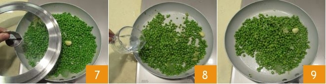 luego cubrid con una tapadera 7. Continuad la cocción durante unos 15-20 minutos. Durante la cocción podéis añadir agua para que los guisantes no se sequen demasiado 8. Una vez cocidos 9, eliminad el diente de ajo