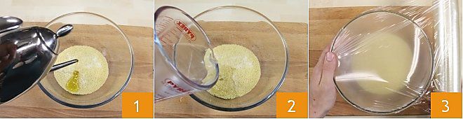 Para preparar los calamares rellenos de cuscús, comienza vertiendo el cuscús en un bol. Añade sal, condimenta con un poco de aceite 1 y vierte la misma cantidad de agua hirviendo 2. Cubre el bol con film plástico y deja reposar hasta que el cuscús se haya hinchado, duplicando su volumen 3.