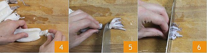 Mientras tanto dedícate a la limpieza de los calamares. Para entender en detalle cómo realizar esta operación, consulta la Escuela de cocina: cómo limpiar calamares, que encuentras aquí. Lávalos con cuidado bajo agua corriente e incide con un cuchillito la parte final del manto, lo suficiente para tomar un extremo de la piel y quitarla con las manos o ayudándote con un cuchillito. Luego separa delicadamente la cabeza del manto 4, extrae la pluma de cartílago, que se encuentra en el manto, y las vísceras. Toma la cabeza extraída y separa los tentáculos 5. Después pica los tentáculos y resérvalos en un cuenco pequeño 6.