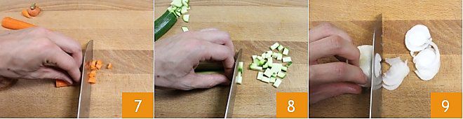 En este punto lava las verduras con cuidado. Toma la zanahoria, pélala y tras cortarla a lo largo, forma dados 7. Limpia el calabacín, divídelo por la mitad y córtalo en dados 8. Pela la cebolleta fresca, límpiala y córtala en rodajas 9. Ten en cuenta que todas las verduras deben cortarse en trozos pequeños, que constituirán parte del relleno de los calamares, consulta nuestra Escuela de cocina: cómo cortar las verduras para descubrir cómo cortar mejor tus verduras.