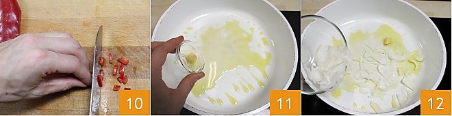 Toma el pimiento y tras limpiarlo y vaciarlo de la parte dura interna con sus semillas, utiliza solo la mitad. Divide la mitad del pimiento en bastones y de estos haz cubos 10. Luego pela un diente de ajo y quítale su germen interno, vierte 2 cucharadas de aceite de oliva virgen extra en una sartén antiadherente y dora el ajo 11. Luego añade la cebolleta cortada finamente 12 y sofríe. Para evitar que el sofrito se queme, agrega medio vaso de agua (o caldo de verduras).