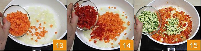 Incorpora las zanahorias y el pimiento en dados (13-14), deja cocinar durante 5 minutos y mientras tanto añade sal y pimienta al gusto. Cuando las verduras comiencen a ablandarse, añade también el calabacín en dados 15.
