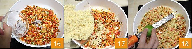 Agrega a la mezcla también los tentáculos de calamar picados 16 y deja cocinar por otros 2 minutos. Pasado este tiempo, apaga el fuego, añade el cuscús 17, que sumergido en el agua habrá duplicado su volumen, y ralladura la cáscara de lima 18, previamente enjuagada bajo agua corriente.