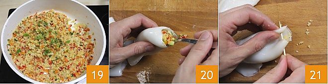 Para enriquecer el relleno con una nota extra de fragancia, lava una ramita de menta fresca, deshoja y añade algunas hojas 19. A este punto toma los calamares vacíos y limpios y ayudándote con una cucharita, rellénalos con la mezcla hasta dos tercios de su capacidad 20. Finalmente, sella los calamares con un palillo, para evitar que el relleno se salga durante la cocción 21.