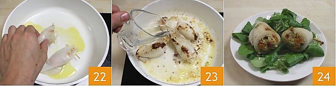 Toma ahora una sartén antiadherente, calienta 2 cucharadas de aceite de oliva virgen extra y coloca los calamares rellenos 22, luego añade sal y pimienta al gusto. Cocina los calamares 5 minutos de un lado y 5 del otro y para evitar que los calamares resulten gomosos, rocíalos con un vaso de vino blanco durante la cocción 23. Cuando el líquido de cocción se haya reducido y el vino se haya evaporado, puedes retirar los calamares del fuego, para terminar, sazónalos con algunas hojas de tomillo. Para presentarlos de manera creativa, córtalos por la mitad, de modo que se vea el relleno colorido, y sírvelos sobre un lecho de ensalada 24.
