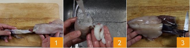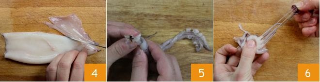Para terminar la limpieza del manto, siempre con un cuchillo, quitad las aletas para utilizarlas en la preparación 4. Ahora, retomad la cabeza que habíais reservado y separadla de los tentáculos haciendo una incisión con un cuchillo un poco debajo de los ojos. Tomad los tentáculos y eliminad el diente central de este modo: abrid los tentáculos hacia el exterior con las manos y empujad hacia arriba la parte central, es decir, la boca 5. Con las manos, quitad la piel de los tentáculos 6. Enjuagad cuidadosamente todas las partes del calamar limpias bajo agua corriente y reservadlas en un bol mientras continuáis con la preparación.