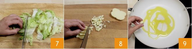 Lavad el manojo de escarola, luego cortad las hojas groseramente 7, eliminando la parte del tallo. Luego, cortad también la provola en daditos 8. Preparad también las aceitunas (si no tenéis las deshuesadas, podéis quitar el hueso ayudándoos con un cuchillo). En una sartén, calentad un chorrito de aceite y añadid el diente de ajo pelado 9.