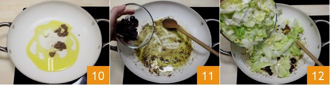 Luego verted los filetes de anchoas 10 y derretidlos a fuego lento mezclando con una cuchara de madera. Luego, añadid las aceitunas deshuesadas 11 y la escarola 12.