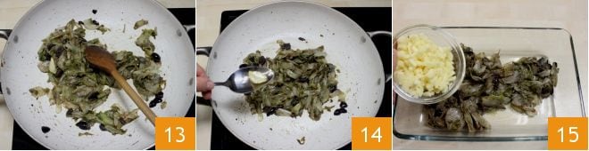 Ajustad de sal y pimienta, mezclad 13 y cocinad durante 20 minutos, hasta que la escarola esté marchita y se haya sazonado. Luego, apagad el fuego, quitad el ajo de la sartén 14 y trasladad la escarola a un bol para que se enfríe. Cuando esté fría, añadid la provola en daditos 15 y mezclad los ingredientes del relleno.