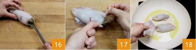 Ahora podéis empezar a rellenar los calamares. Con una cuchara, verted el relleno en cada calamar y ayudaos con unas pinzas para llenar bien el manto hasta el fondo 16. Luego, cerrad el calamar con un palillo pasándolo entre los bordes del manto 17. Tomad una sartén amplia y calentad un chorrito de aceite. Añadid los calamares para cocinarlos por ambos lados.