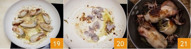 Cocinadlos durante unos 20 minutos a fuego medio 19, dándoles vuelta a menudo. Cuando estén cocidos, retiradlos de la sartén y dejad el fondo de cocción en el que podréis cocinar las cabezas que habíais limpiado previamente 20 durante unos diez minutos. Luego, apagad el fuego y servid las cabezas junto con los calamares rellenos de escarola 21!