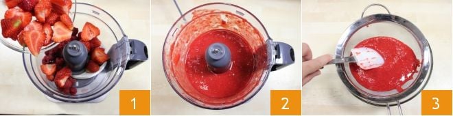 Para preparar los canutillos de masa filo con merengue de frutos rojos, lo primero que debes hacer es preparar el merengue: lava y seca bien las frambuesas y las fresas. Tritura los frutos rojos en un procesador (1-2) y pasa el líquido obtenido por un tamiz para filtrar las semillas de los frutos (el líquido filtrado deberá pesar aproximadamente 75 g) 3.