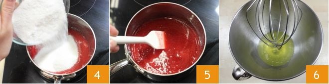 En un cazo, mezcla el jugo de la fruta con 100 g de azúcar 4, revuelve con una cuchara 5 verificando la temperatura con un termómetro de cocina. Mientras tanto, cuando el jarabe haya alcanzado 115°, monta las claras de huevo en una batidora de pie 6,
