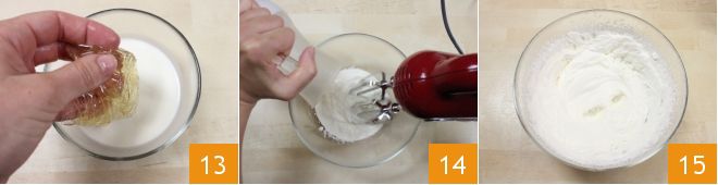 y disuélvela en 50 ml de nata caliente 13. Monta los restantes 250 ml de nata (14-15) (para más detalles sobre este procedimiento consulta la ficha Cómo montar la nata de nuestra escuela de cocina).