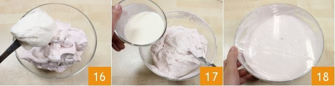 mezcla suavemente la nata montada con el merengue 16, revolviendo de abajo hacia arriba, para que no se desmonte, finalmente vierte la nata en la que has disuelto la gelatina 17 y mezcla bien, cubre con film transparente 18 y coloca en el frigorífico a enfriar al menos un par de horas.