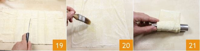 Ahora prepara los canutillos: desenrolla la masa filo y divídela por la mitad 19 y pincela cada hoja con mantequilla derretida 20, luego superpón tres hojas una sobre otra y divídelas en tres partes a lo ancho y luego por la mitad a lo largo, obteniendo rectángulos de aproximadamente 7 x 10 cm. Enrolla cada rectángulo en el molde para canutillos 21 asegurándote de que la parte sin mantequilla esté en contacto con el molde (de lo contrario, después de la cocción no se despegarán del molde).