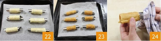 Coloca los canutillos en una bandeja para horno cubierta con papel de horno 22, pincela la superficie con mantequilla y hornea en horno estático a 200° durante 18 minutos (o en horno ventilado a 180° durante unos 15 minutos). Al finalizar la cocción, saca los canutillos del horno 23, retira el molde con cuidado, ayudándote con un paño para no quemarte con el molde 24 y déjalos enfriar sobre una rejilla.