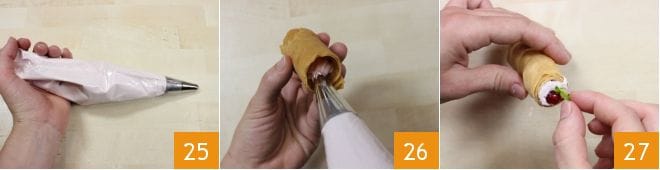 Transfiere la crema, ya enfriada, a una manga pastelera 25 y rellena los canutillos 26. Decora con una grosella y una hoja de menta 27, espolvorea la superficie con azúcar glas y sirve. ¡Tus canutillos de masa filo con merengue de frutos rojos están listos para ser disfrutados!