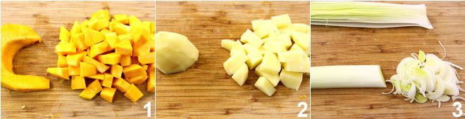 Para preparar el cappuccino de calabaza, comience eliminando la piel y las semillas internas de la calabaza con la ayuda de una cuchara y cortando la pulpa en cubitos 1. Pele las patatas y córtelas también en cubitos 2. Limpie el puerro y córtelo muy finamente 3.